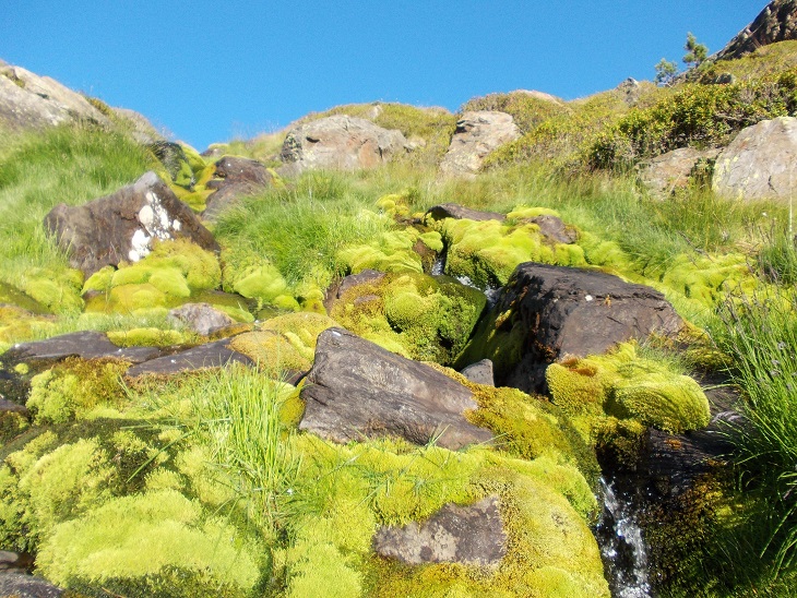 Arrivée à la passerelle, il faut contourner le rocher par la gauche et monter dans la pente: on rejoint le sentier montant vers l’estany d’Areste.