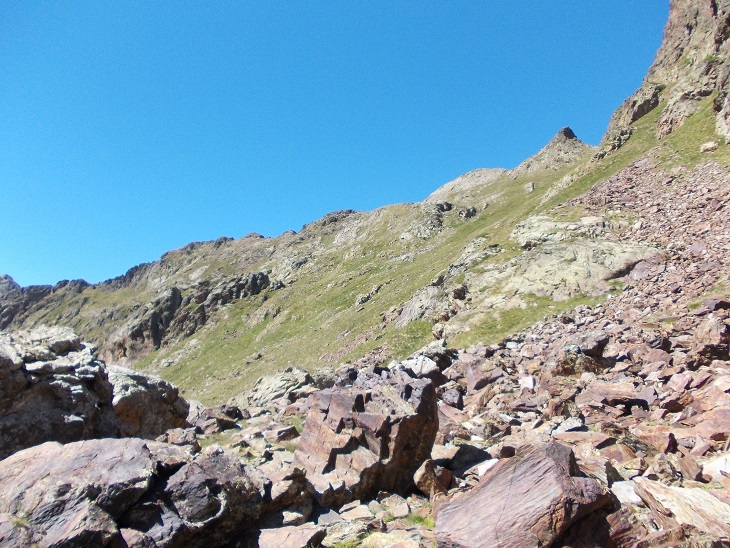 Je remonte vers le col à droite du petit pic pointu juste en dessous du pic de Canalbona vers 2850 m.