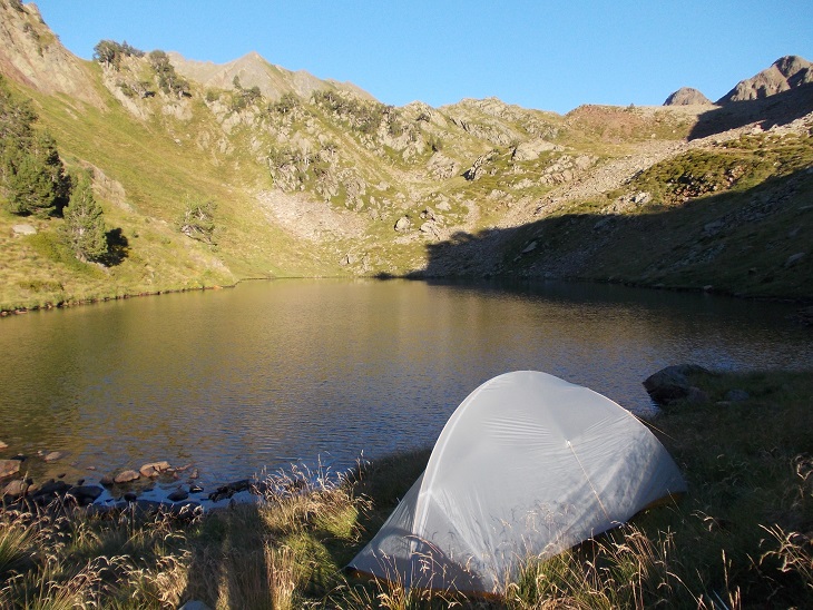 Bivouac à la base de l’étang, pas facile de trouver une place, il faut monter légèrement sur la droite pour plus de surface plate. La source est à 10 m à coté, il y a du bois, idéal.