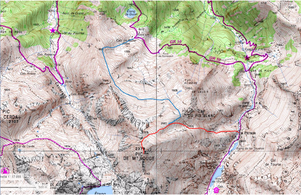 Le Pic de Mont Rouge (2379 m) se gravit normalement , comme le Pic de Mède, par l’étang d’Aubé.