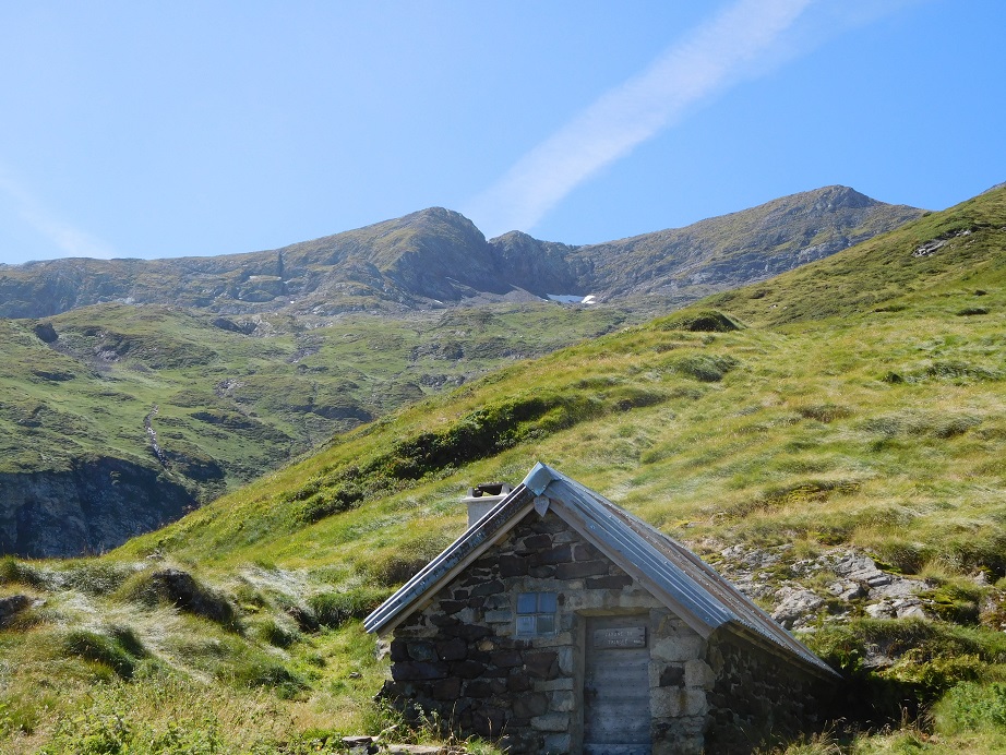 A la cabane de Trinqué, on voit une vague sente montant pleine pente.