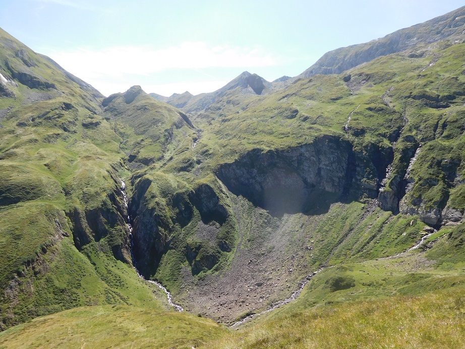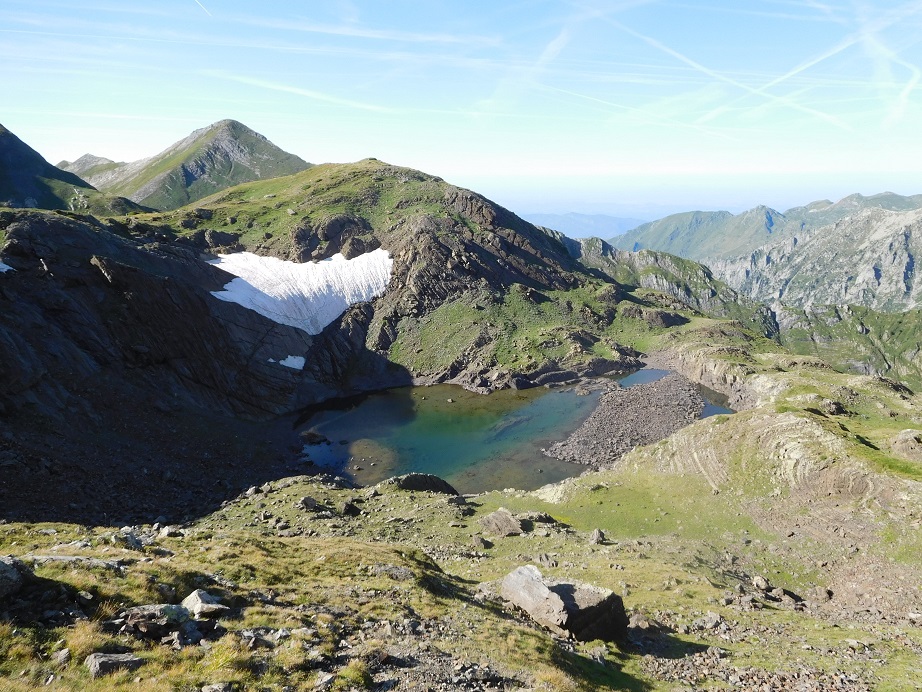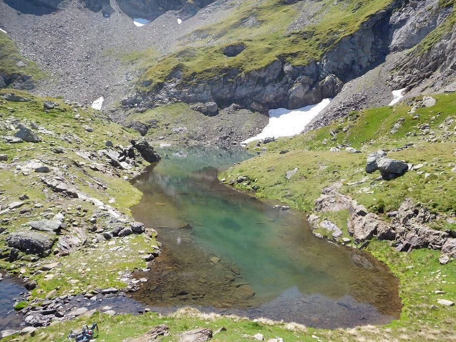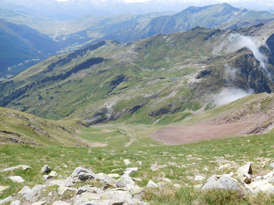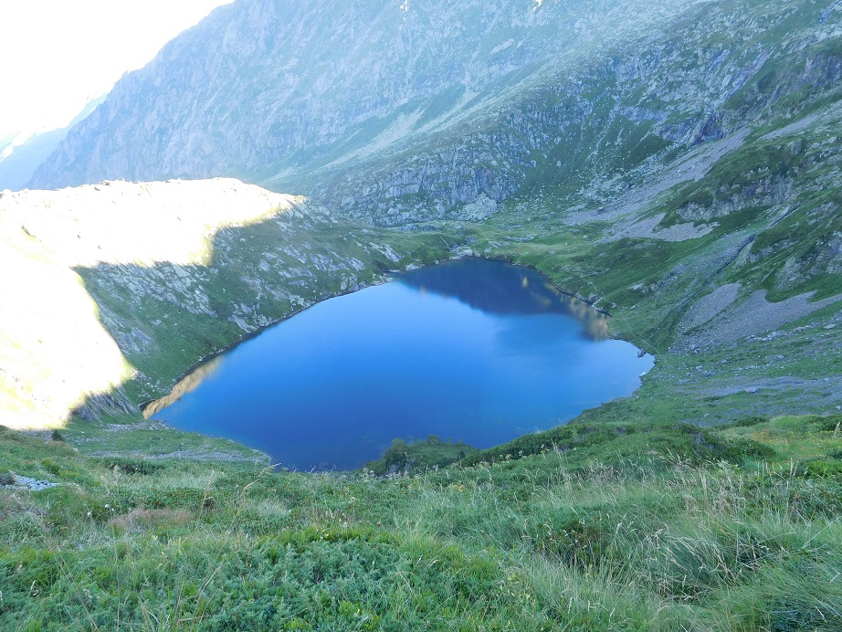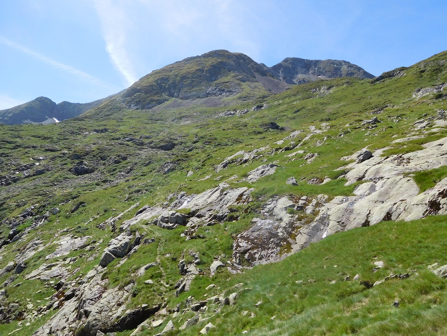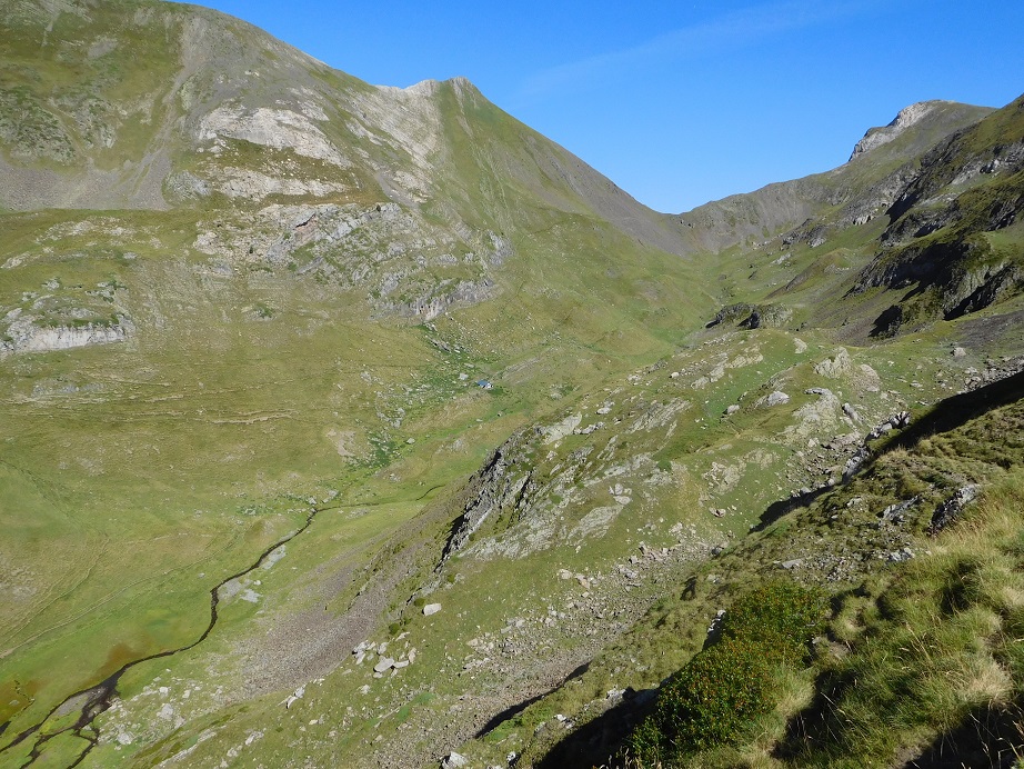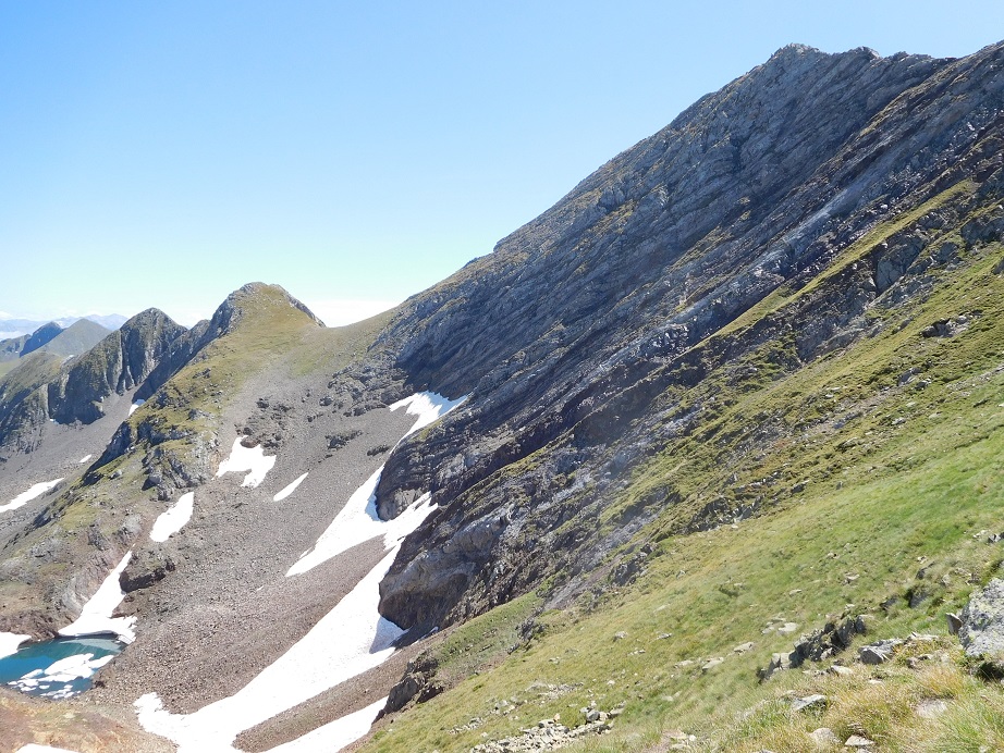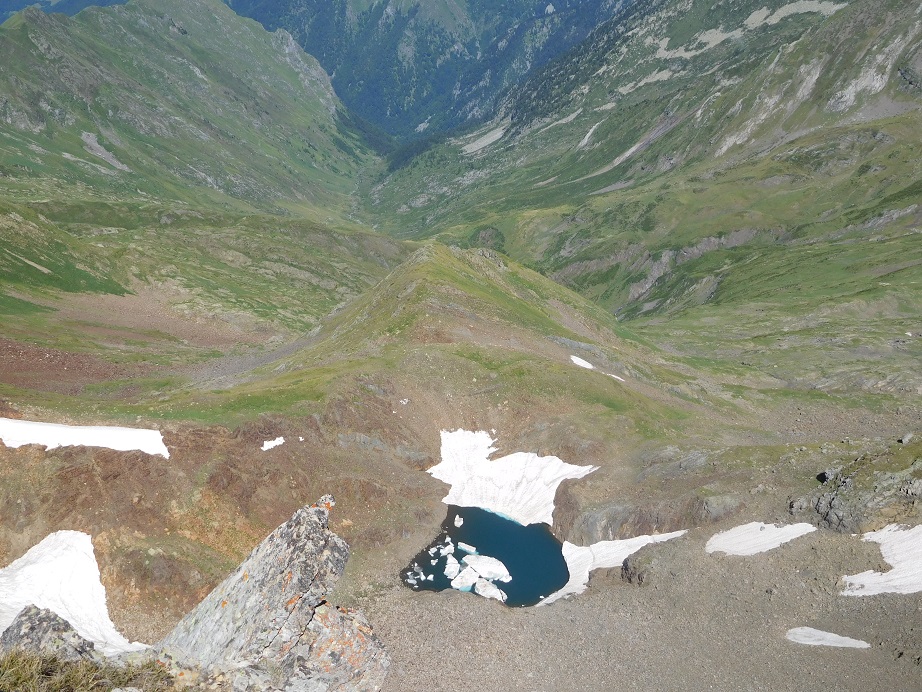 Descente à l’étang, on voit la brèche empruntée: si l’on ne veut pas monter aux sommets, il est facile de descendre de la brèche directement à l’étang.