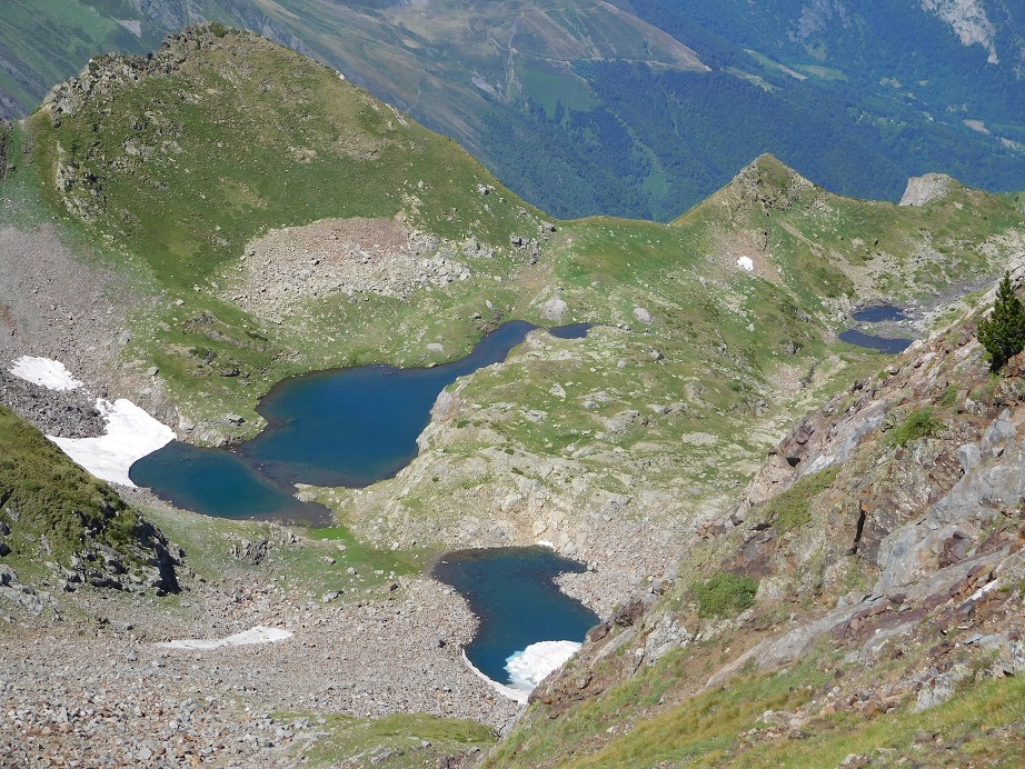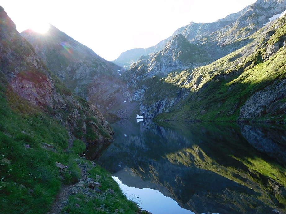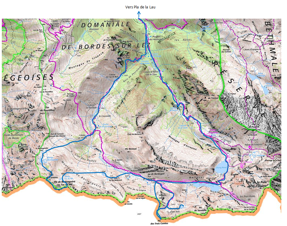 Départ de la maison du Valier au Pla de La Lau, montée par la vallée de Peyralade, hors sentier à partir de la cabane de Trinqué, étangs de la Montagnette, pic de Cornave puis pic de Barlonguère, passage aux étangs de Bédérech, port de Barlonguère, bivouac à l’étang sous le pic des Trois Comtes, pic des Trois Comtes et retour classique par les étangs Long et Rond.