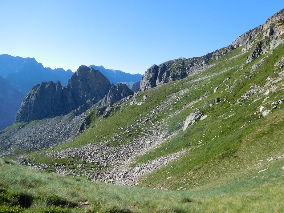 Arrivé au col, vue sur le pic de Bourbonne, en effet la suite n’est pas simple. J’hésite entre faire le pic ou descendre vers l’étang de Landrène pour remonter le cirque.