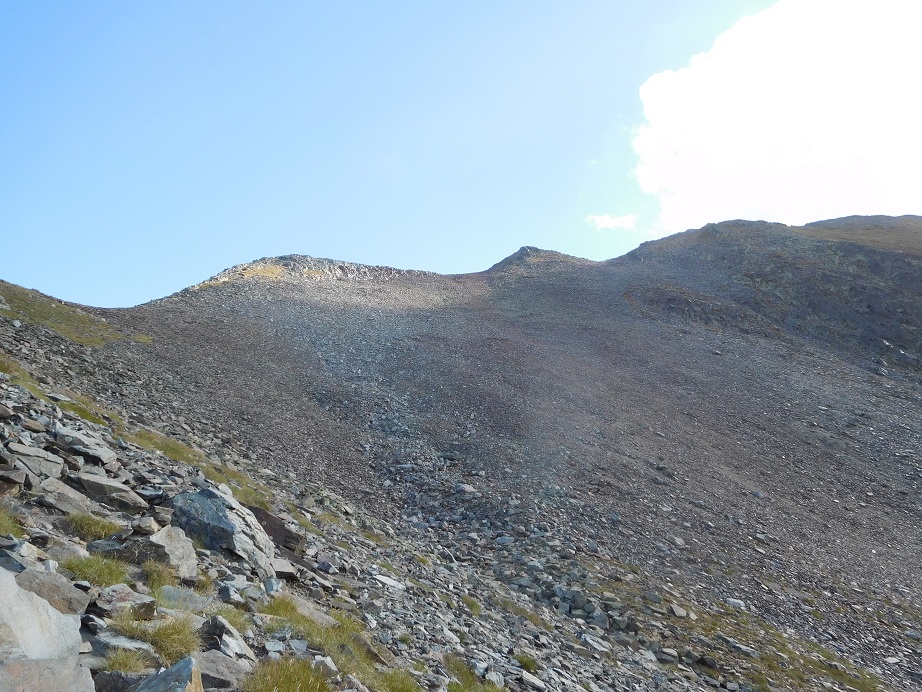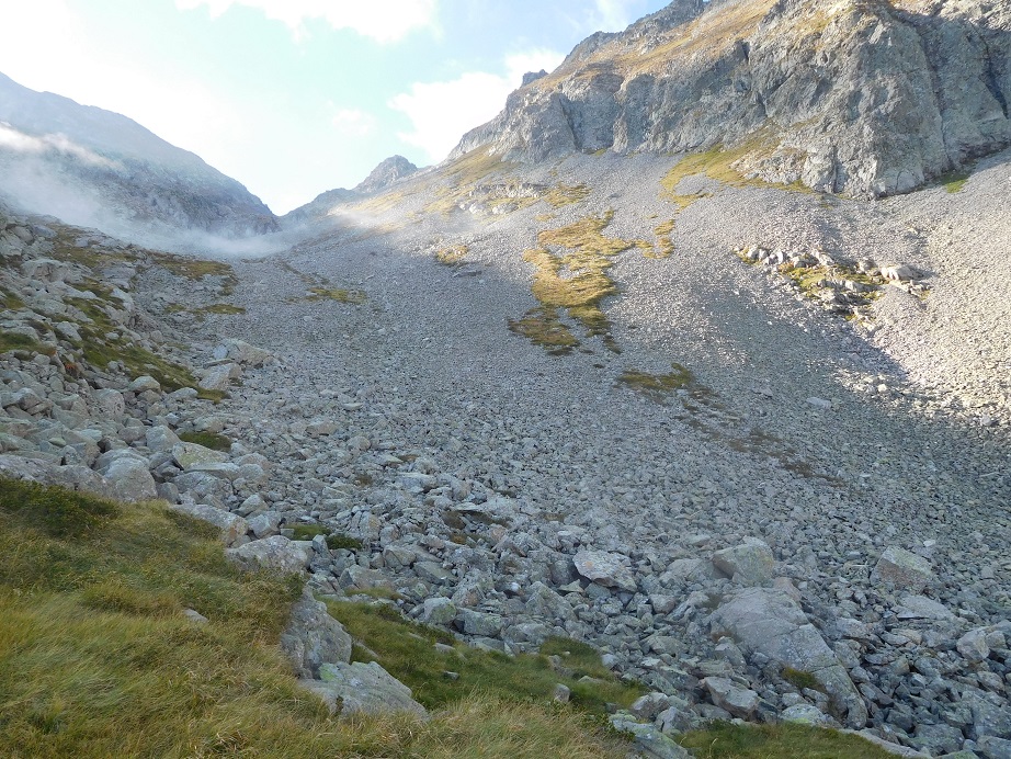 Il faut remonter le ravin de l’Aliot en mixte herbe/cailloux jusqu’au col.