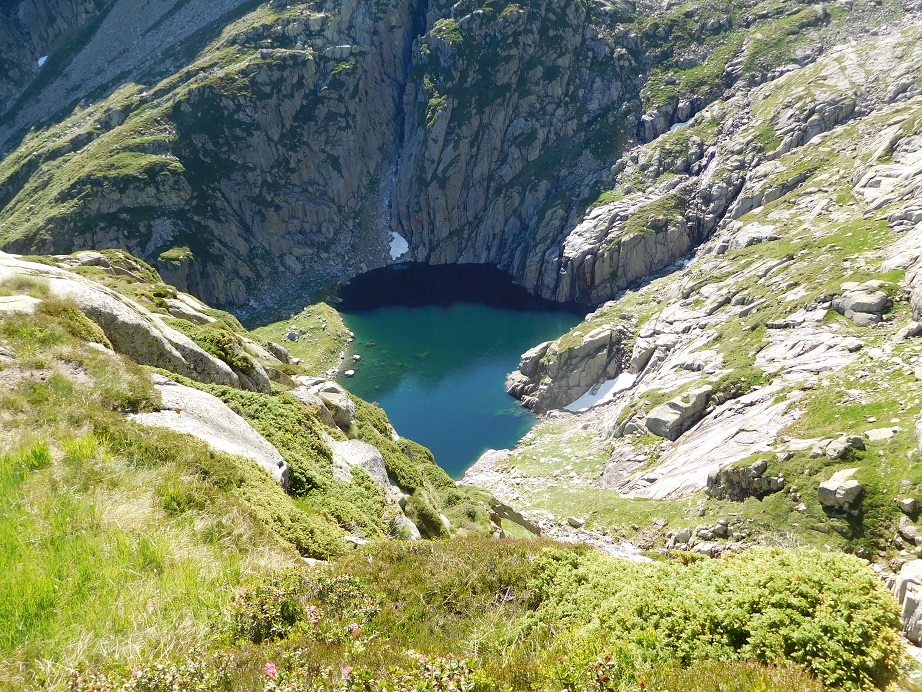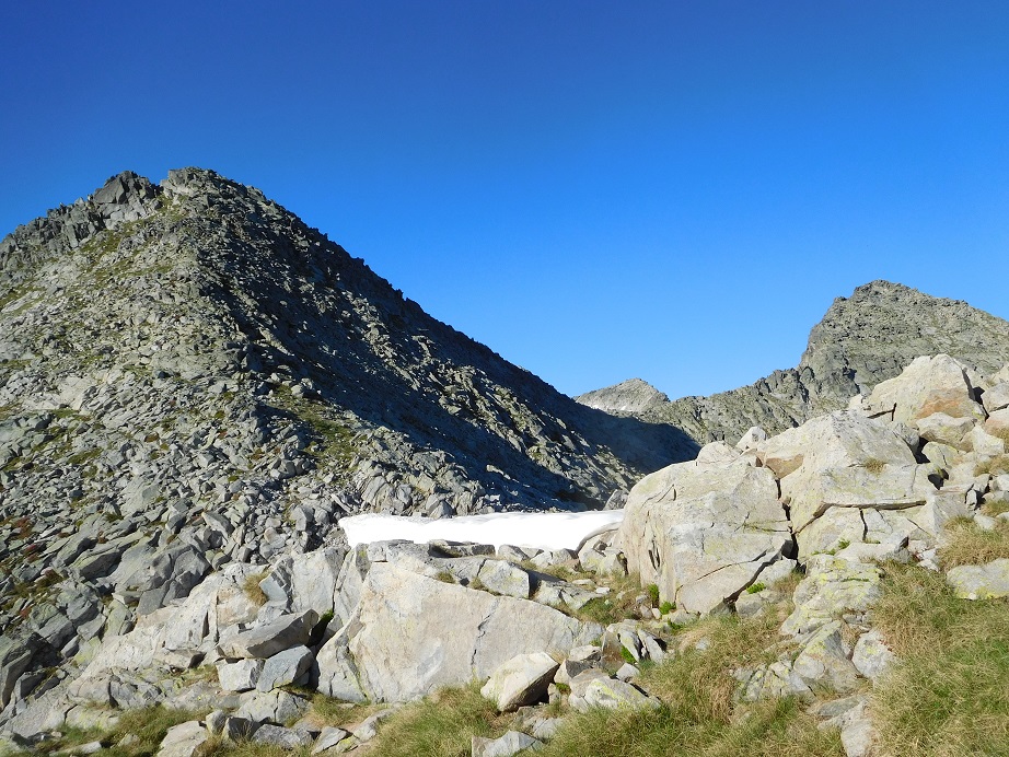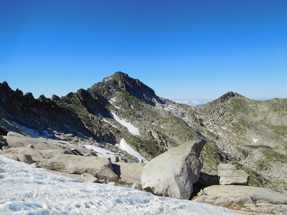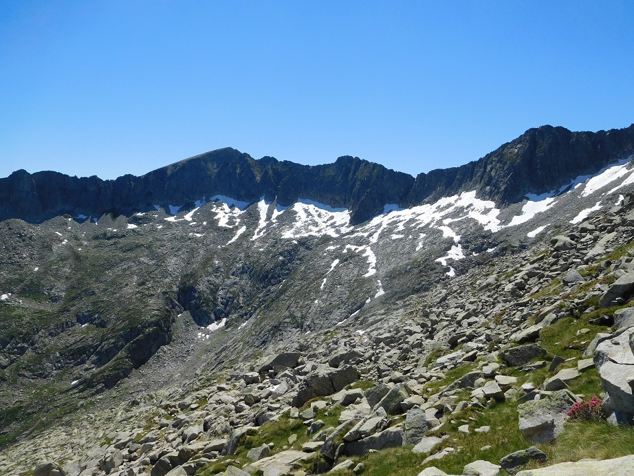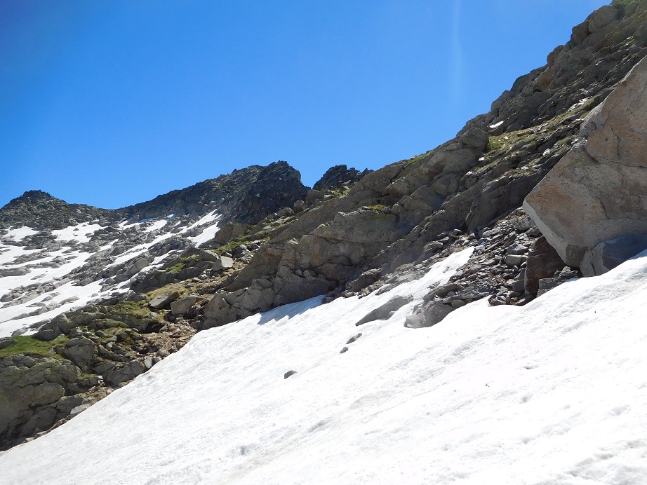 Pour aller au pic Près du Puntussan, j’abandonne la crête pour le flanc est. Ce n’est pas rapide, il faut louvoyer, certains névés sont trop pentus.