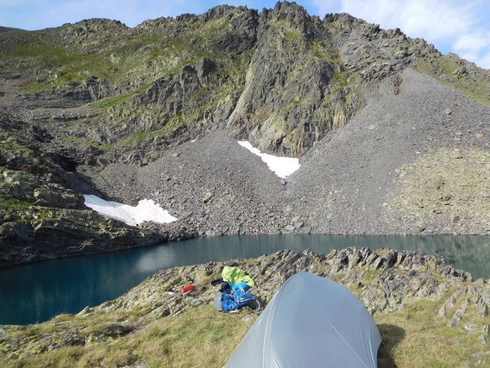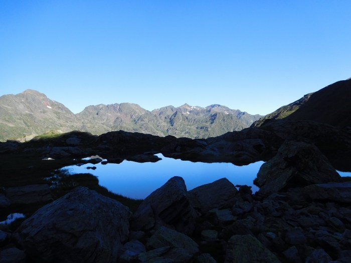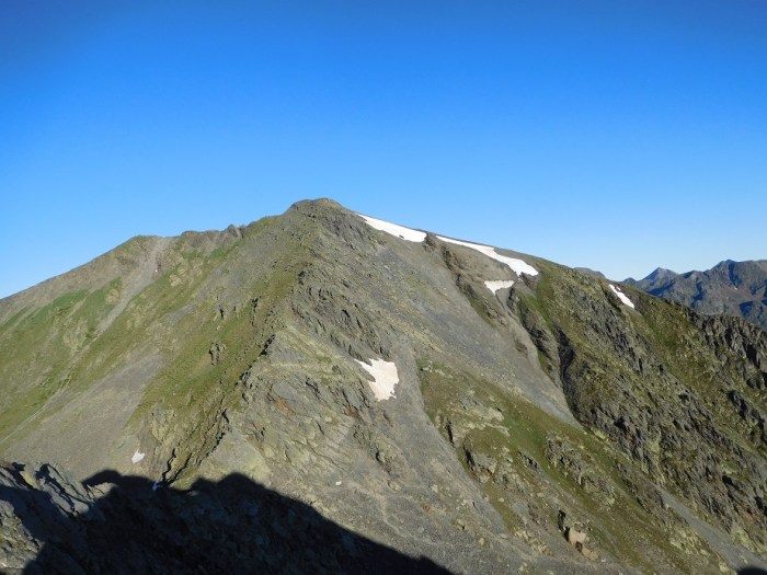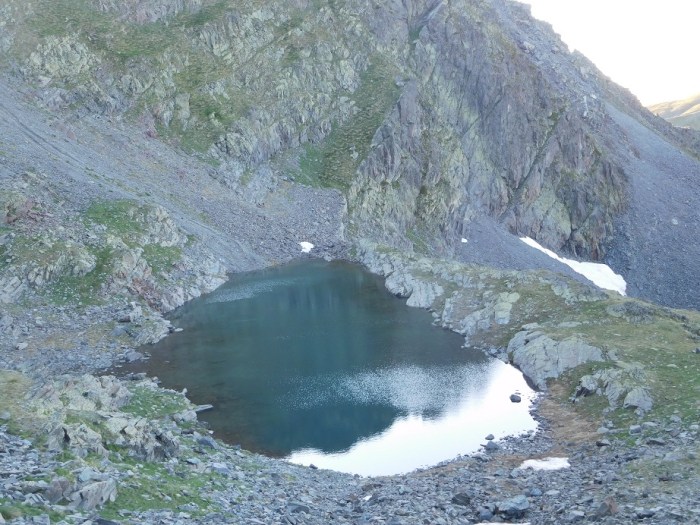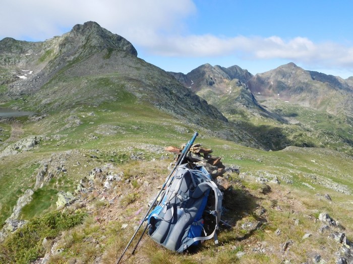 Initialement, je voulais soit faire ce pic, soit la crête, soit descendre aux étangs. Mais le parcours de la veille (D+ de 2200 m) m’a retiré des forces, je n’ai plus le courage de continuer.
