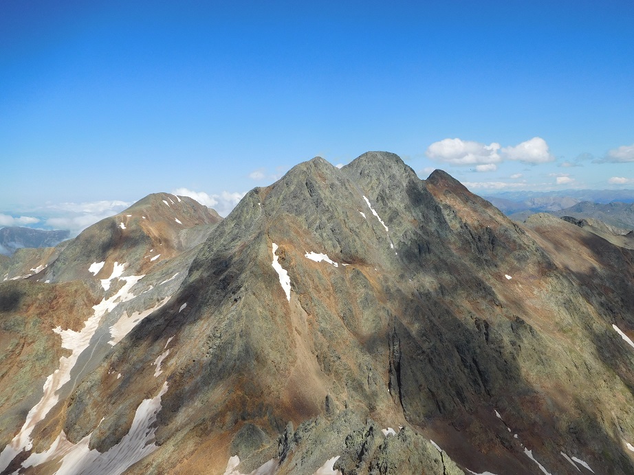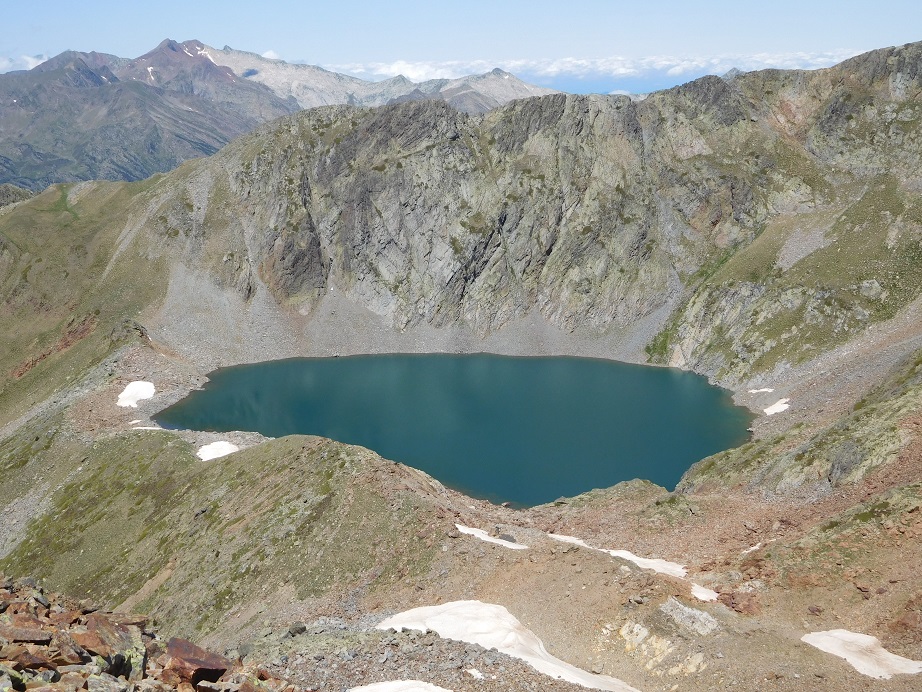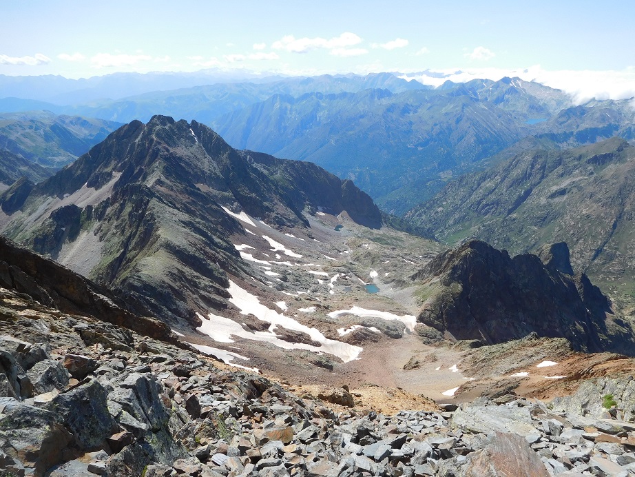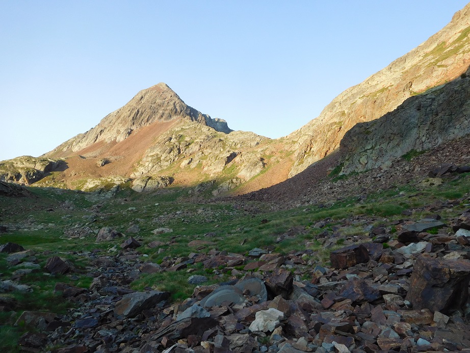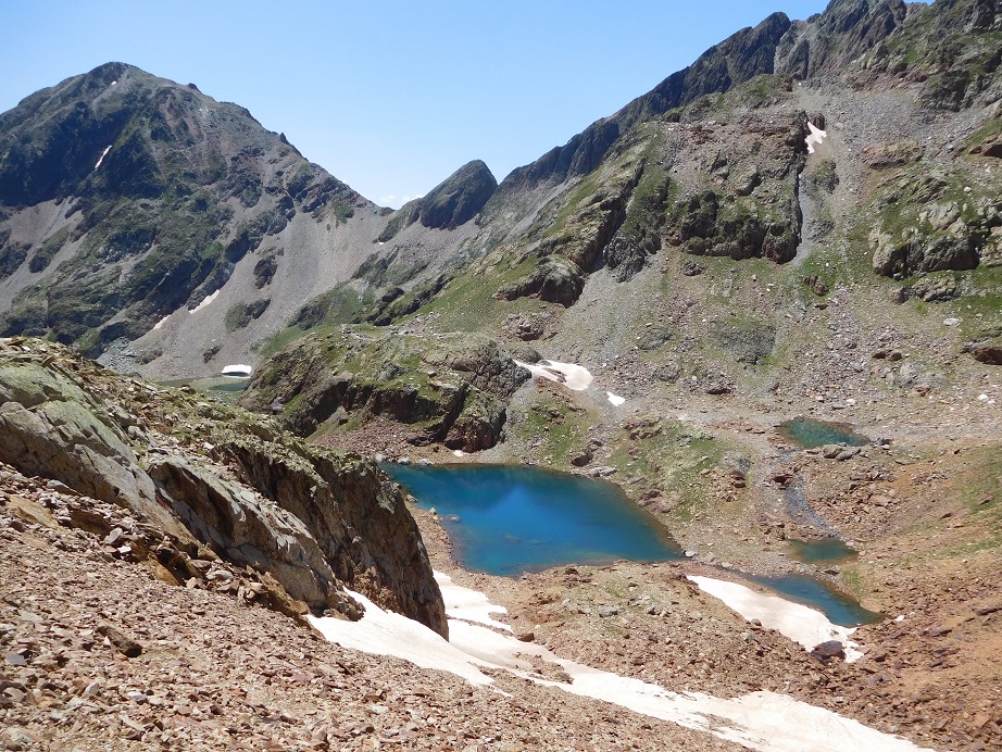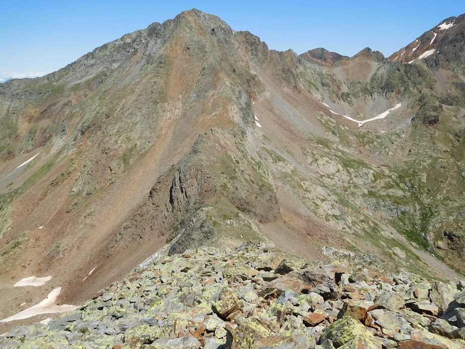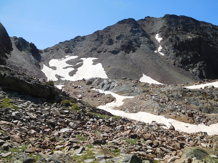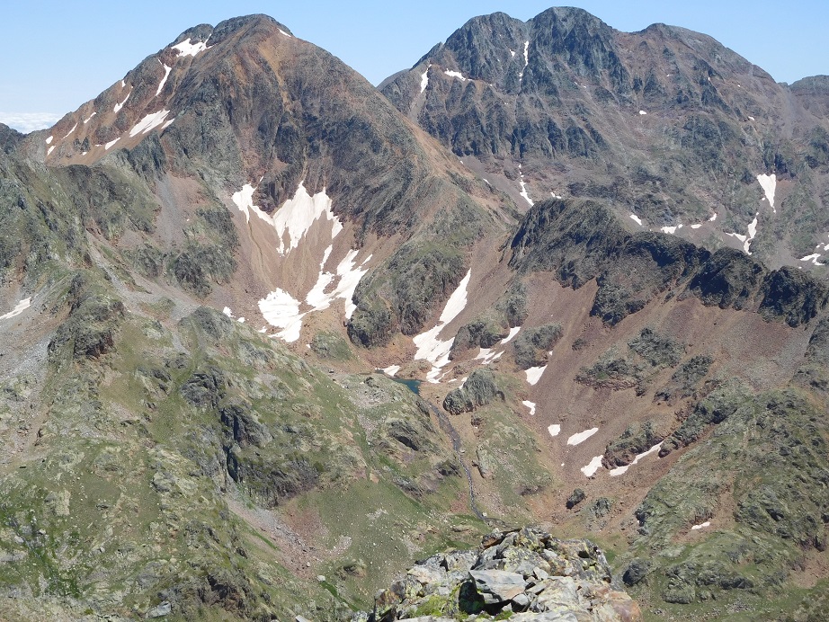 L’Estat à droite et le pic de Sotllo: deuxième objectif de la journée en partant de l’estany, le névé, le pierrier, le col et la crête sud.