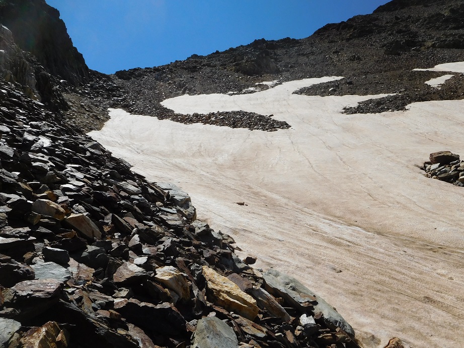 Il y a une sente dans le pierrier mais cachée par le névé, je monte mi neige mi pierrier croulant.