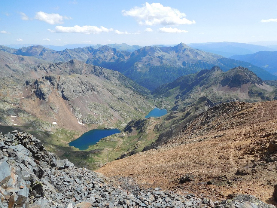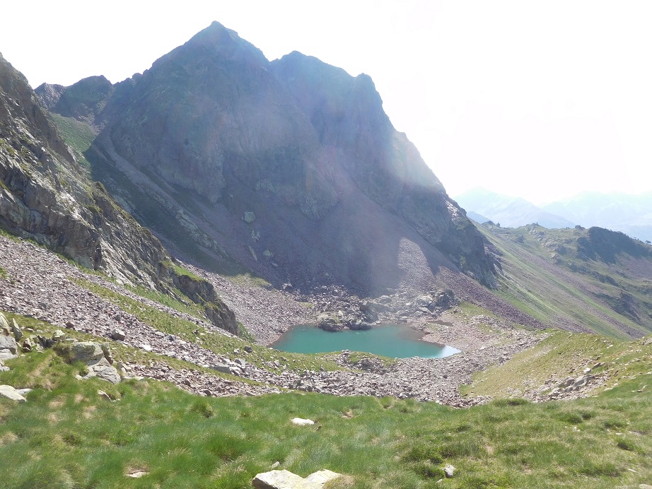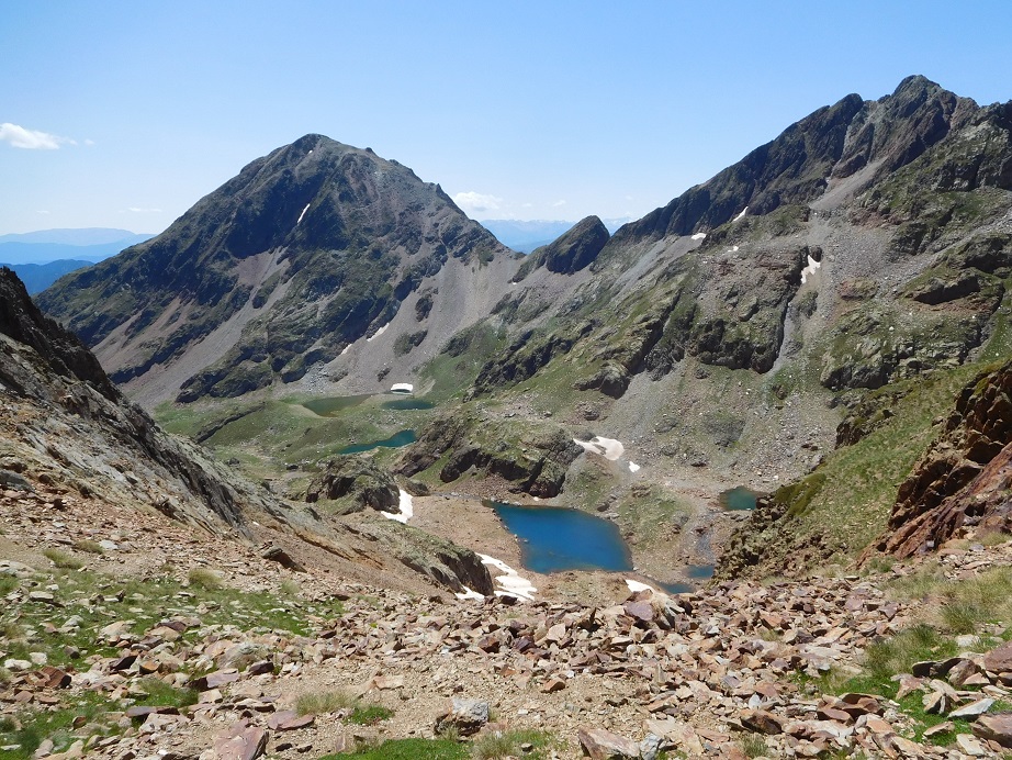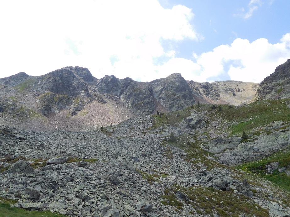 Arrivée aux estanyets de Sotllo et début de montée dans le pierrier, vue sur le pic de Baborte: