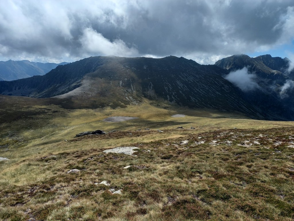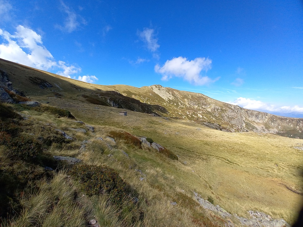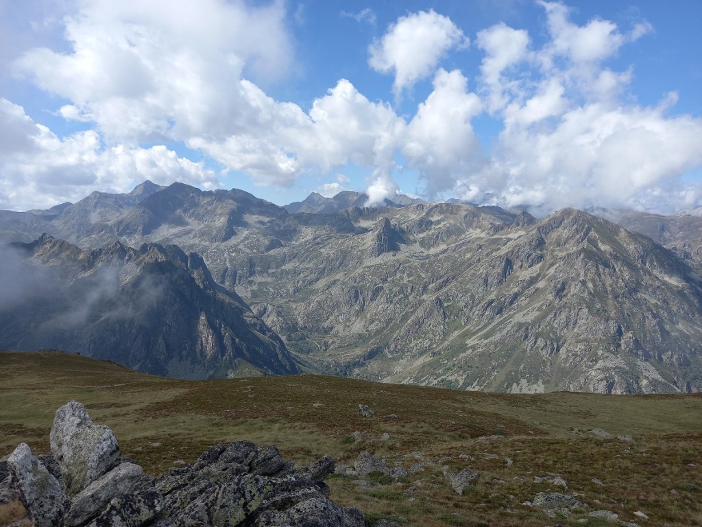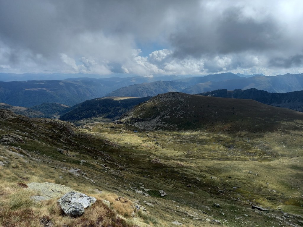 Rapidement un couloir pierreux arrive, facile . Par contre, juste après, un fouillis de cailloux, de trous et d’herbe un peu pénible mais court. Quelques brebis, un patou tout gentil qui me libère le passage.
