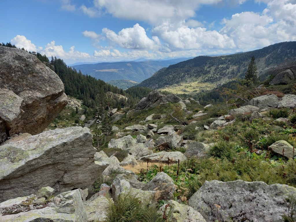 Sur la droite la montagne de Massayre: il y a deux ans, j’étais passé sur ce sommet en venant de la vallée de Calvière et descendu dans ce fatras de barres, de gros rochers , de rhododendrons et d’une forêt compacte, épuisant.