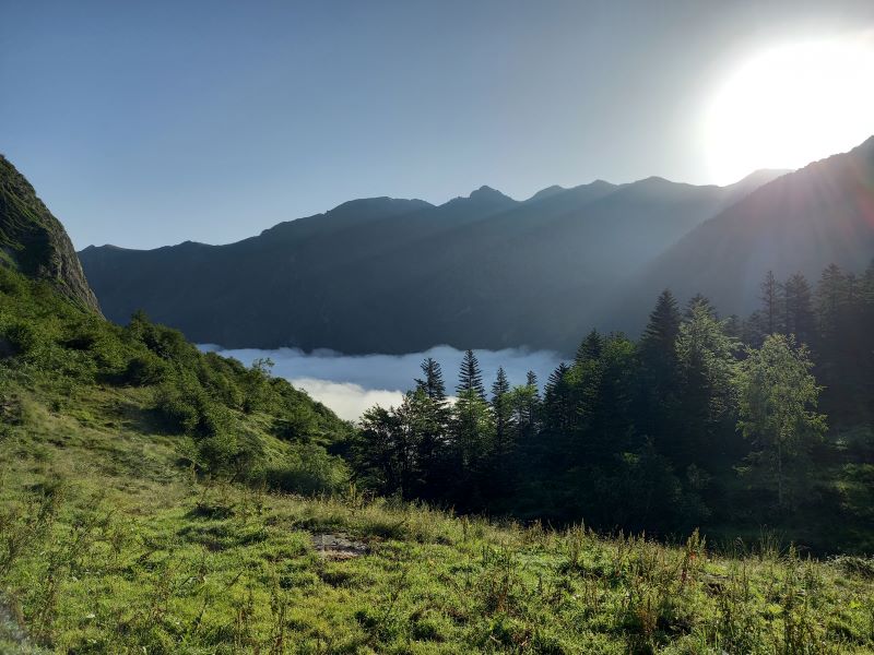 Il faut monter jusqu’à la Fontaine de la Montagnette pour sortir du brouillard. Au fond, le port de l’Esque et le pic de Cornave: