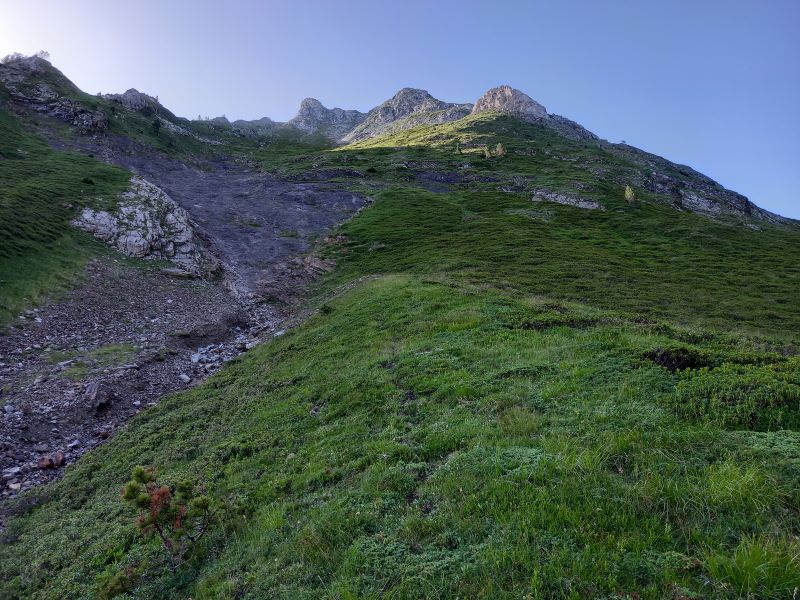 J’arrive rapidement à cette prairie et tout en bas je trouve un chemin un peu aléatoire au début: